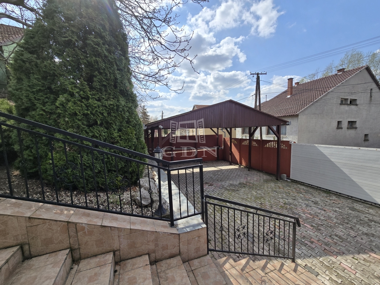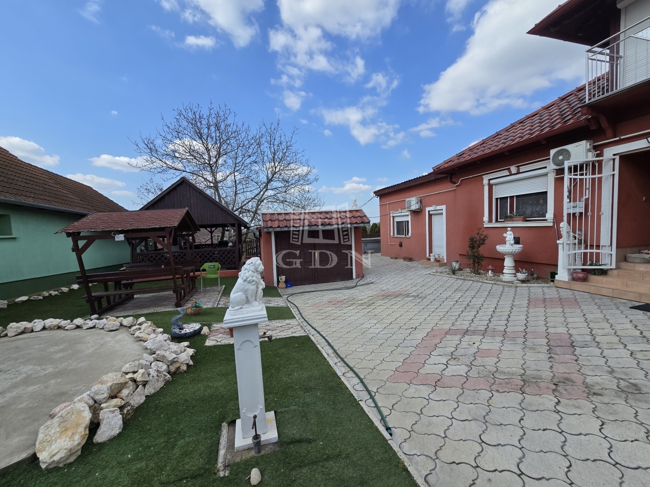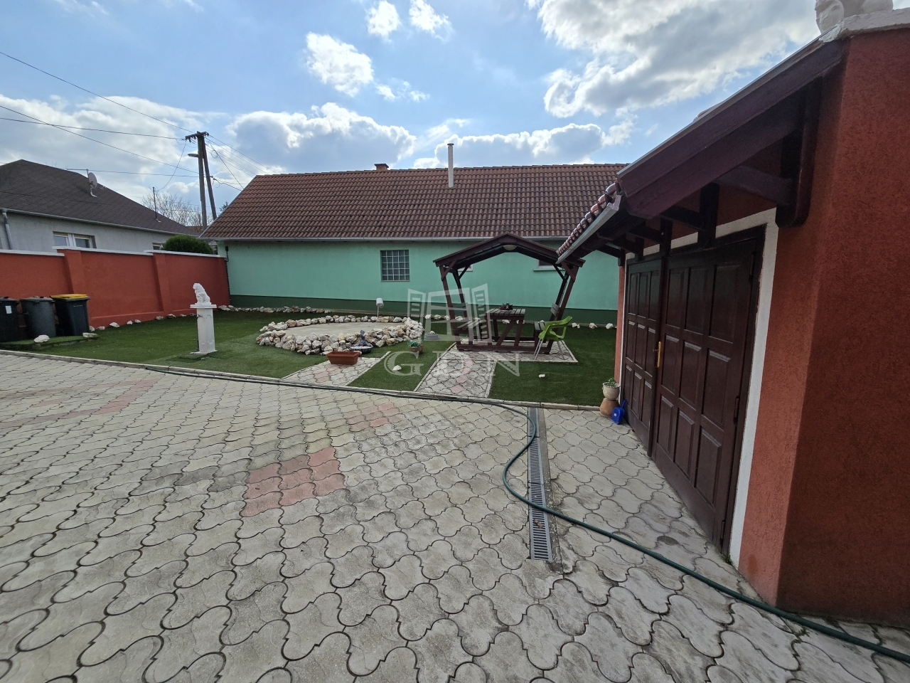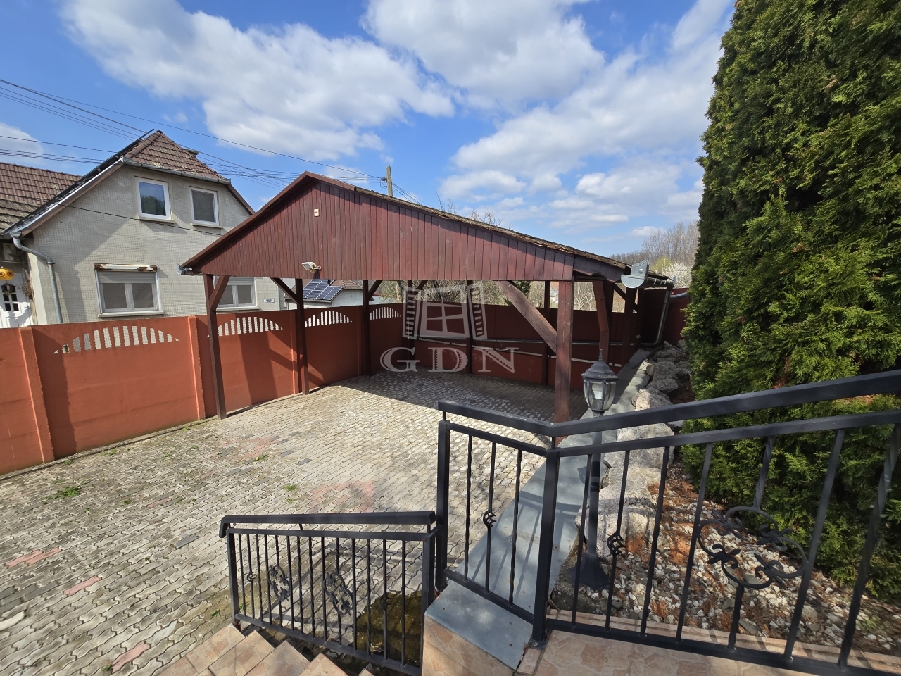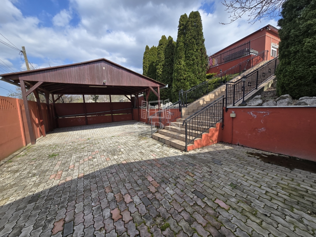 Az alsó udvar szintén részben térkövezett, és külön utcáról is megközelíthető. Itt két fedett gépkocsibeálló került kialakításra, amelyek alatt akár több jármű parkolása is kényelmesen megoldható, így az ingatlan nemcsak nagycsaládosok számára ideális, hanem akár vállalkozási vagy befektetési célra – például szállásadásra – is kiváló lehetőséget kínál.
