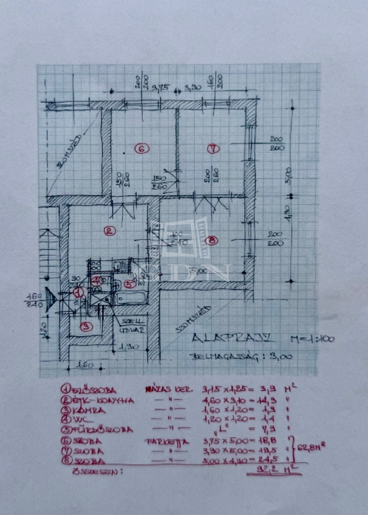 A lakás magasföldszinten (1 emelet magasan) helyezkedik el, 3 szobából, fürdőszobából, konyhából, kamrából és wc-ből áll.