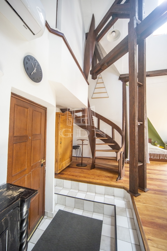 Az újonnan beépített klímával felszerelt lakás belső átriumos kialakítása, valamint a terek elrendezése egyértelműen a klasszikus művész lakás hangulatát árasztja.