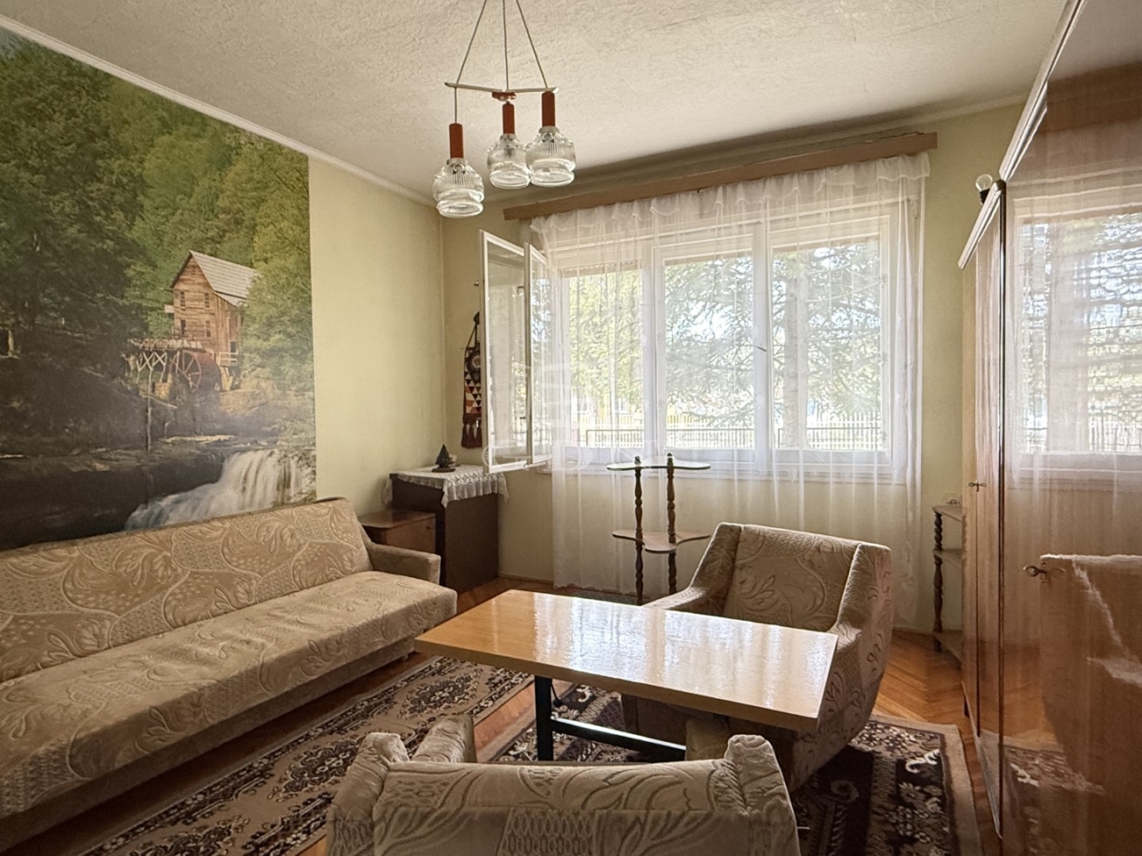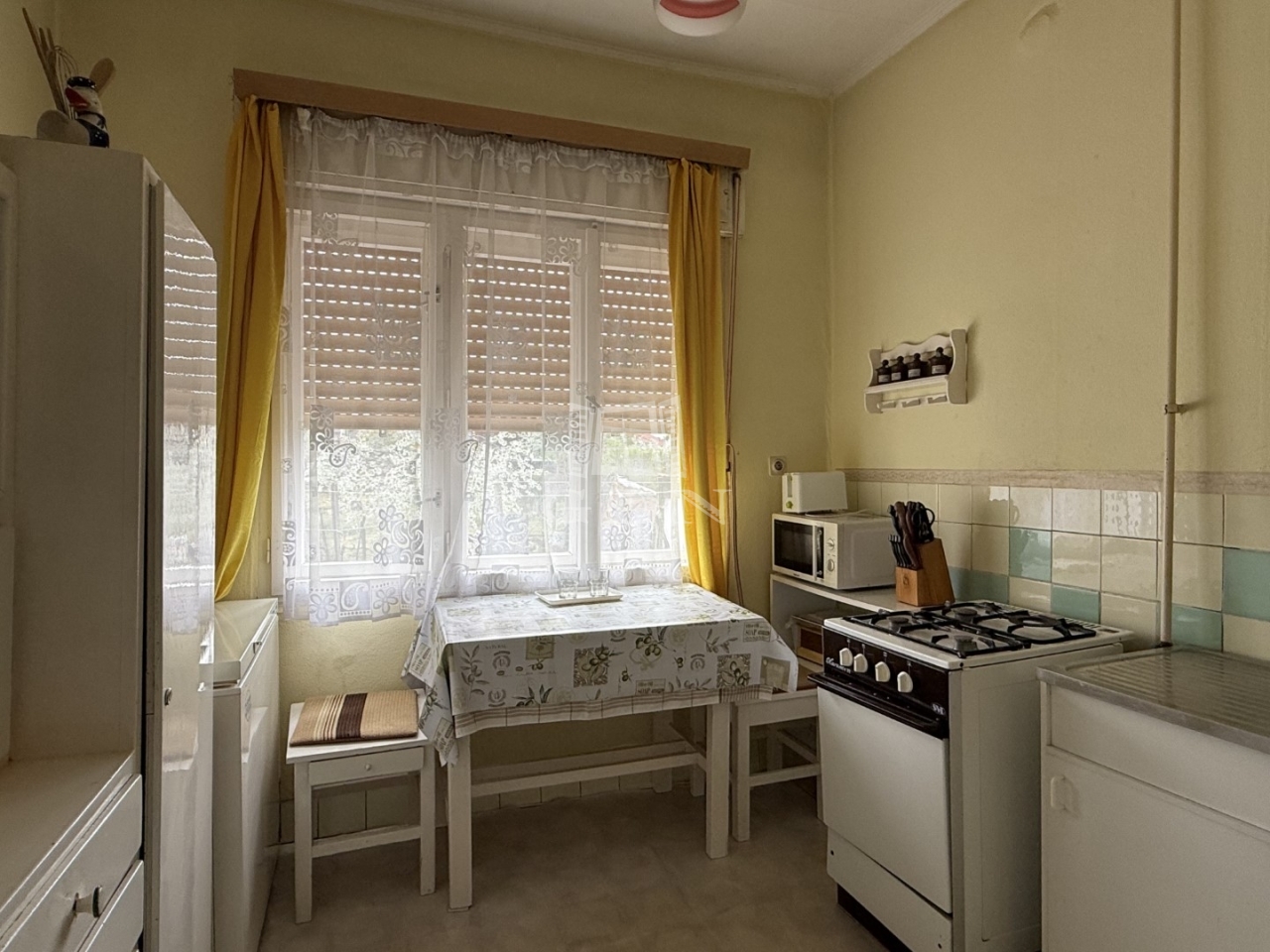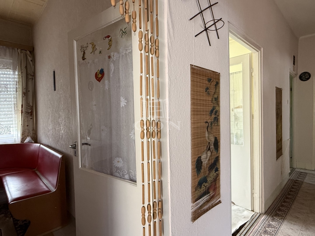 Elosztását tekintve: előszoba, 2 nagyszoba + 1 kisszoba, konyha, étkező, spájz, fürdőszoba, wc, (padlásfeljáró)