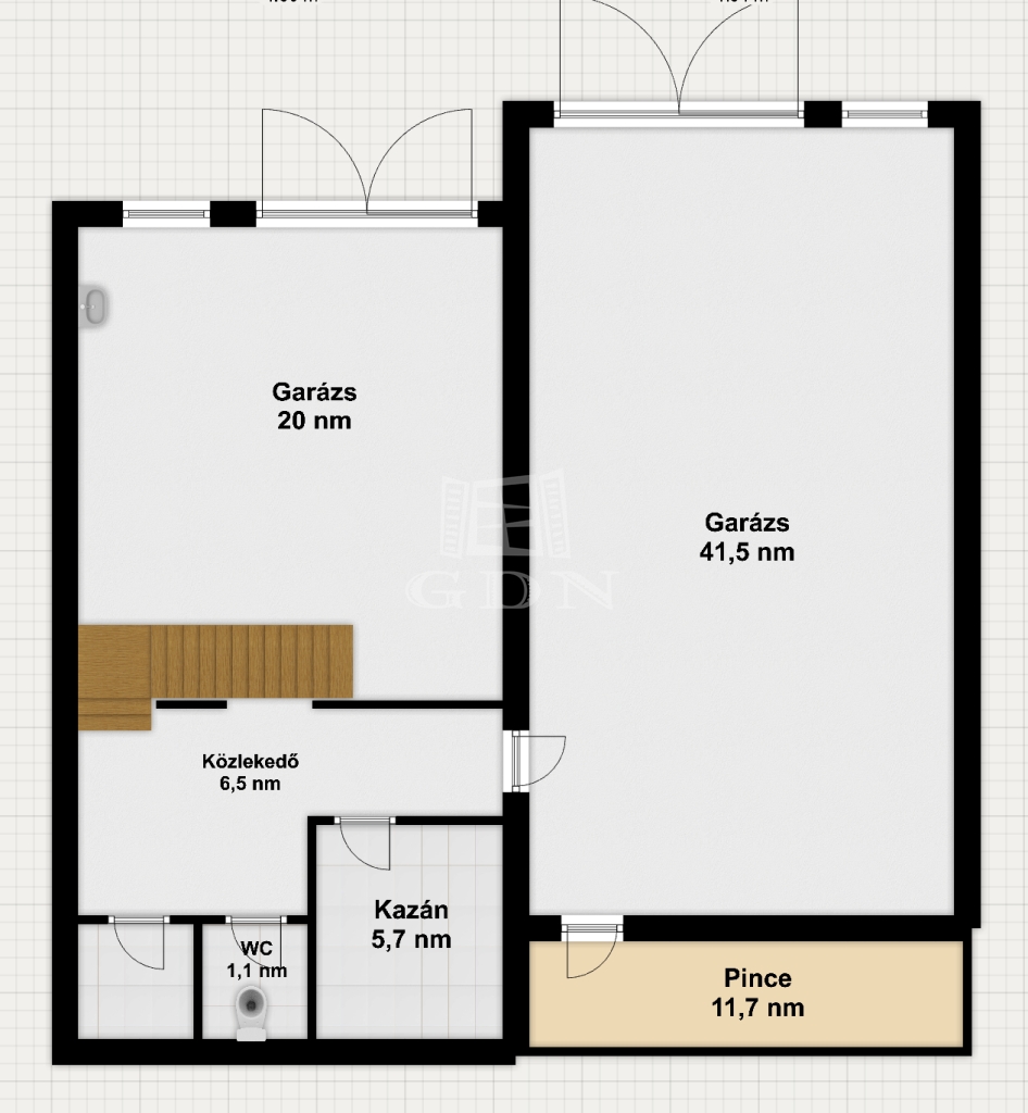 A pinceszinten került kialakításra a dupla garázs, melynek egyik része szerelőaknával, másik része vizesblokkal ellátott. Rendelkezésre áll továbbá a kazánház, tárolók és egyéb kiszolgáló helyiségek is.