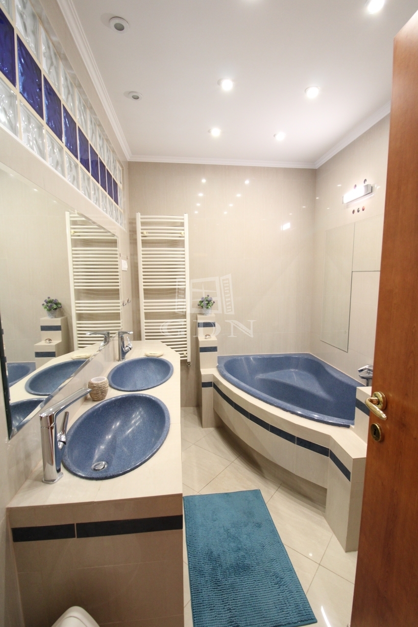 A felső szintre egy kényelmes fokkiosztású lépcsőn juthatunk fel, ahol is a br. 14nm terjedelmű világos előszoba (itt akár külön dolgozó vagy közösségi tér is kialakítható) valamint a 6nm-es kádas duplamosdós fürdő, kettő egyenként br.15,6 és 14nm terjedelmű hálószoba és egy közel 5nm es gardrób került kialakításra.