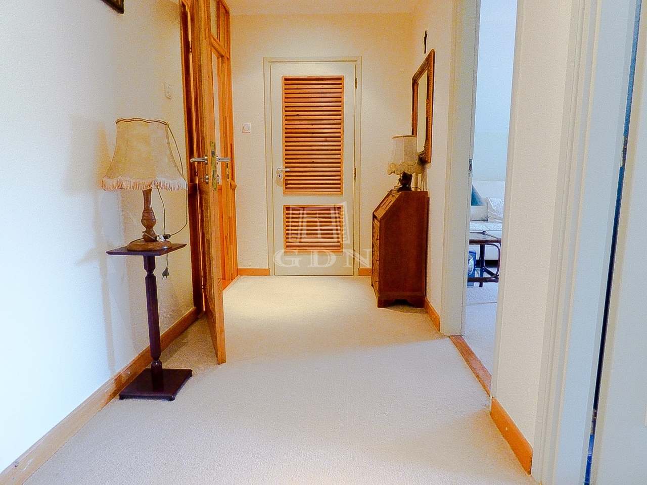A földszinti részre feljuthatunk a külső teraszról vagy a belső lépcsőházból, ezen lakrészen hatalmas, Déli fekvésű bárral felszerelt nappali (49 nm), étkezős konyha (15 nm), fürdőszoba, szülői hálószoba vagy dolgozó szoba lett kialakítva, minden helyiségben radiátoros fűtéssel.