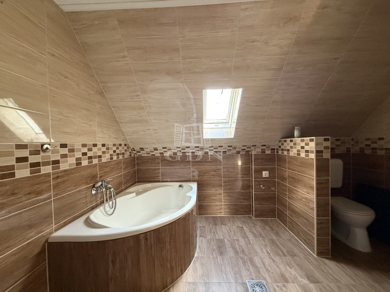 A felső szint: tágas világos nappali + 3 szoba ( az egyikhez gardrób lehetőség, fürdő ( kád és zuhanyzó is ) wc-vel elosztású.