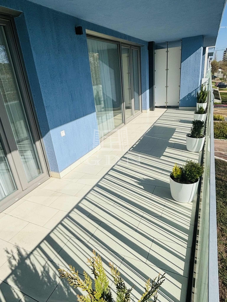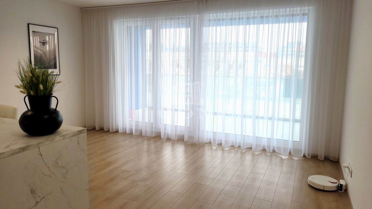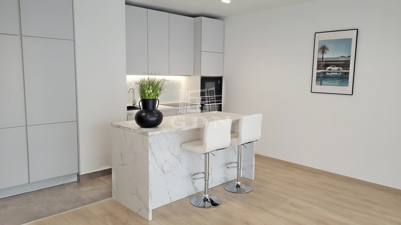 Beépített előszoba, - fürdőszoba (mosógéppel) és konyhabútorral, plusz gépek (sütő, főzőlap, mikrohullámú sütő, szagelszívó, hűtőgép és fagyasztó. Konyha sziget.