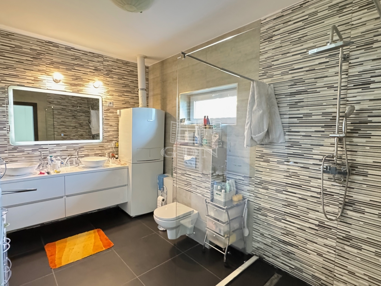A fűtést és meleg víz ellátást BOSCH kondenzációs kazán biztosítja, ahol kerámia burkolat van ott padlófűtés lett beépítve, ahol pedig laminált padló ott radiátorokkal oldották meg a hőleadást.