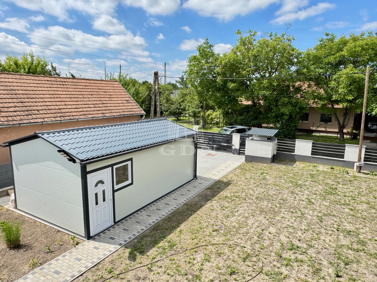 A KÉTSZINTES előkertes ingatlan két utcára nyíló 700 m2-es telken épült fel. A kertben egy autó számára található a külön álló könnyűszerkezetes, árammal ellátott 28 m2-es garázs.