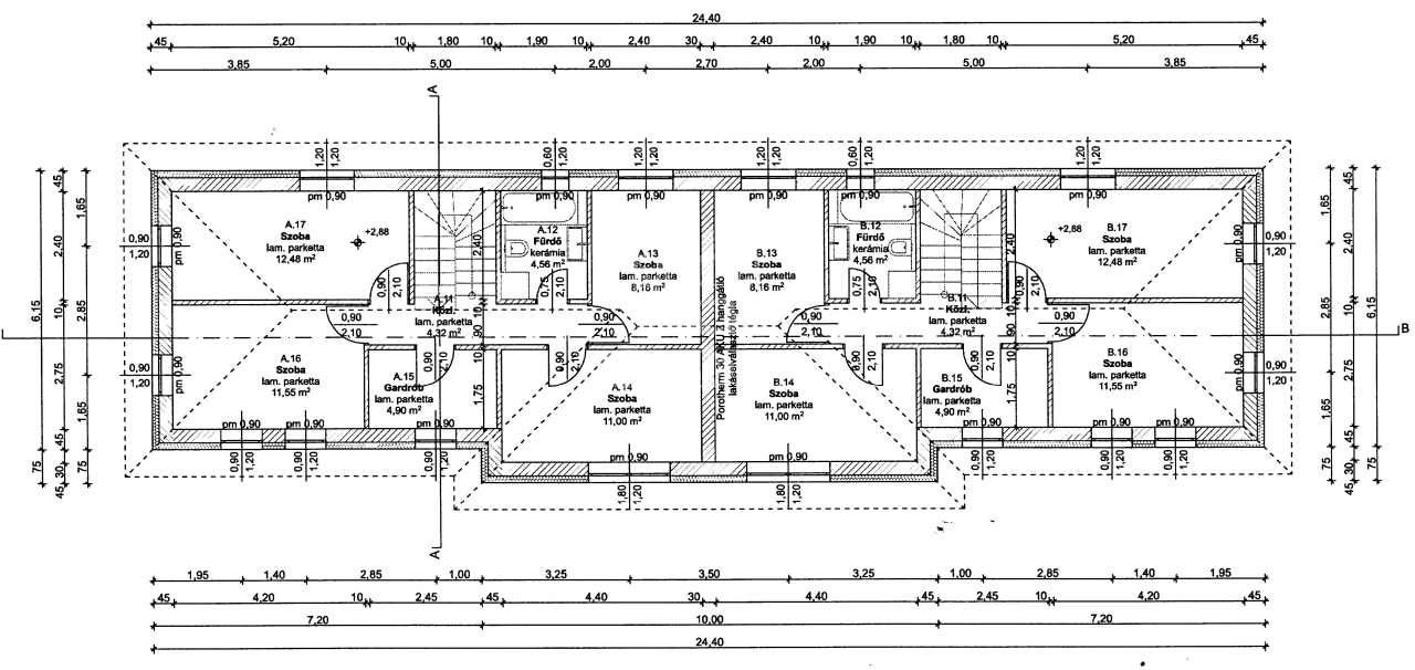 EMELETEN: közlekedő 4,32 m2, fürdőszoba 4,56 m2, 4 szoba (11,55 m2,