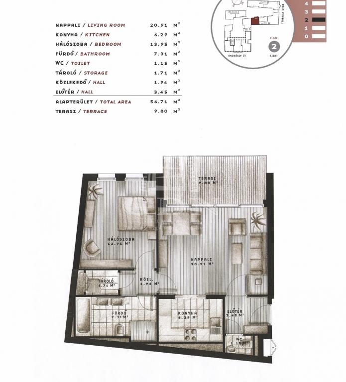 KIADÓ az Andrássy úton az Avenue Gardens épületében egy 56 m2-es ERKÉLYES LUXUS LAKÁS havi 1250 euro + áfa bérleti díjért.
