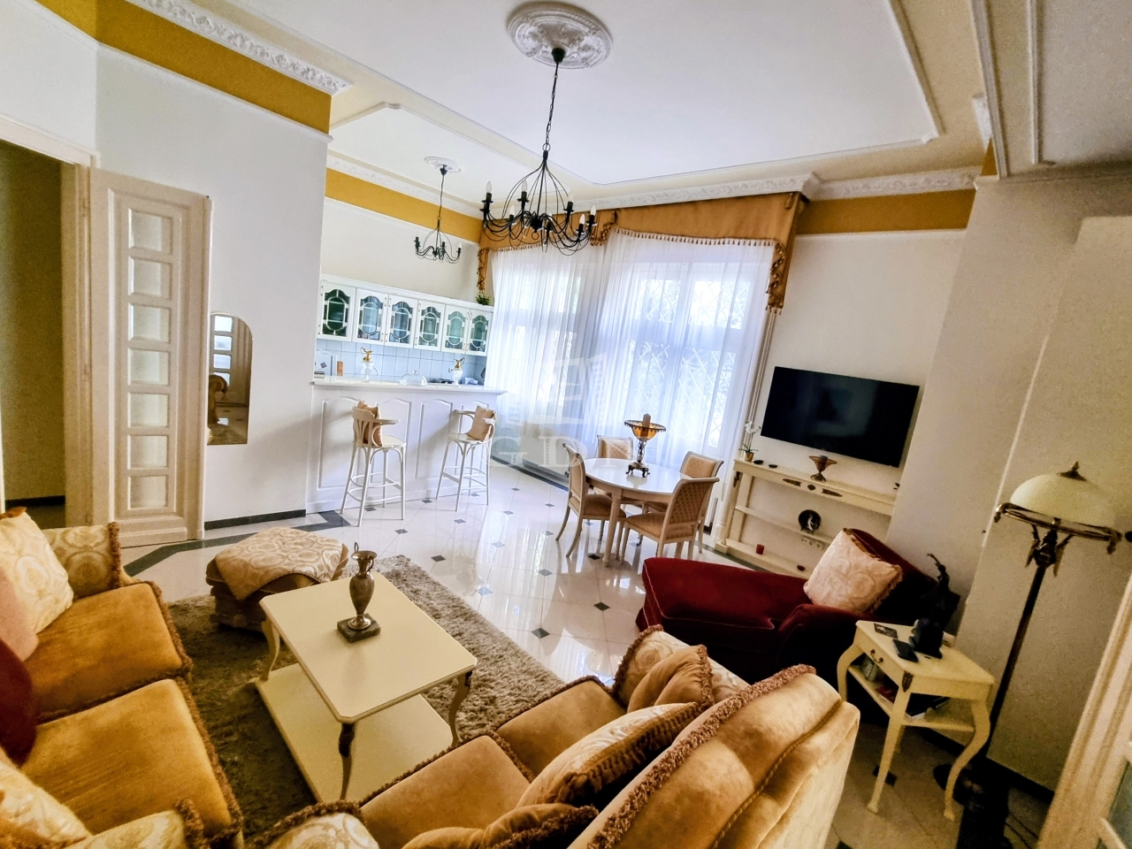 Az 1918- ban épült villa historizáló - eklektikus stílusban épült, az építész annak idején a házat saját magának tervezte, napjainkban folyamatosan karbantartott, állapot megőrzése, illetve javítása érdekében a társasház folyamatosan törődik vele, pályázatokon indul! Eladó ingatlanunk a magasföldszinti szinten helyezkedik el, (alaprajzon a lilával körbejelölt) egyik különlegessége, hogy a házba egy tekintélyes 33 nm-es külső teraszról jutunk be, majd a lakást egy zárt lépcsőházból közelíthetjük meg, ami a szomszéd ingatlannal kizárólagos használatban van.