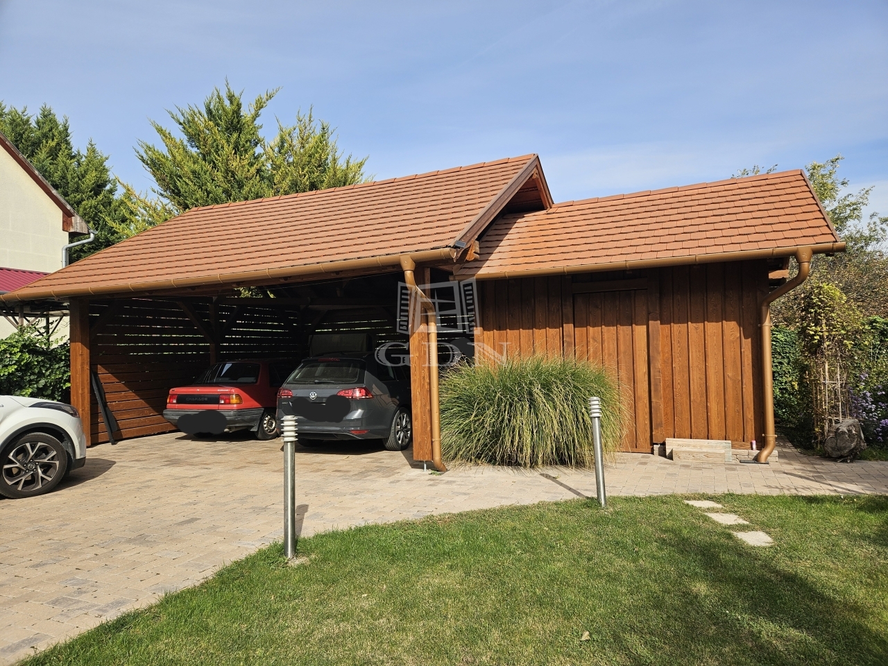 - új két állásos autóbeálló, térkövezett járdák + tároló.