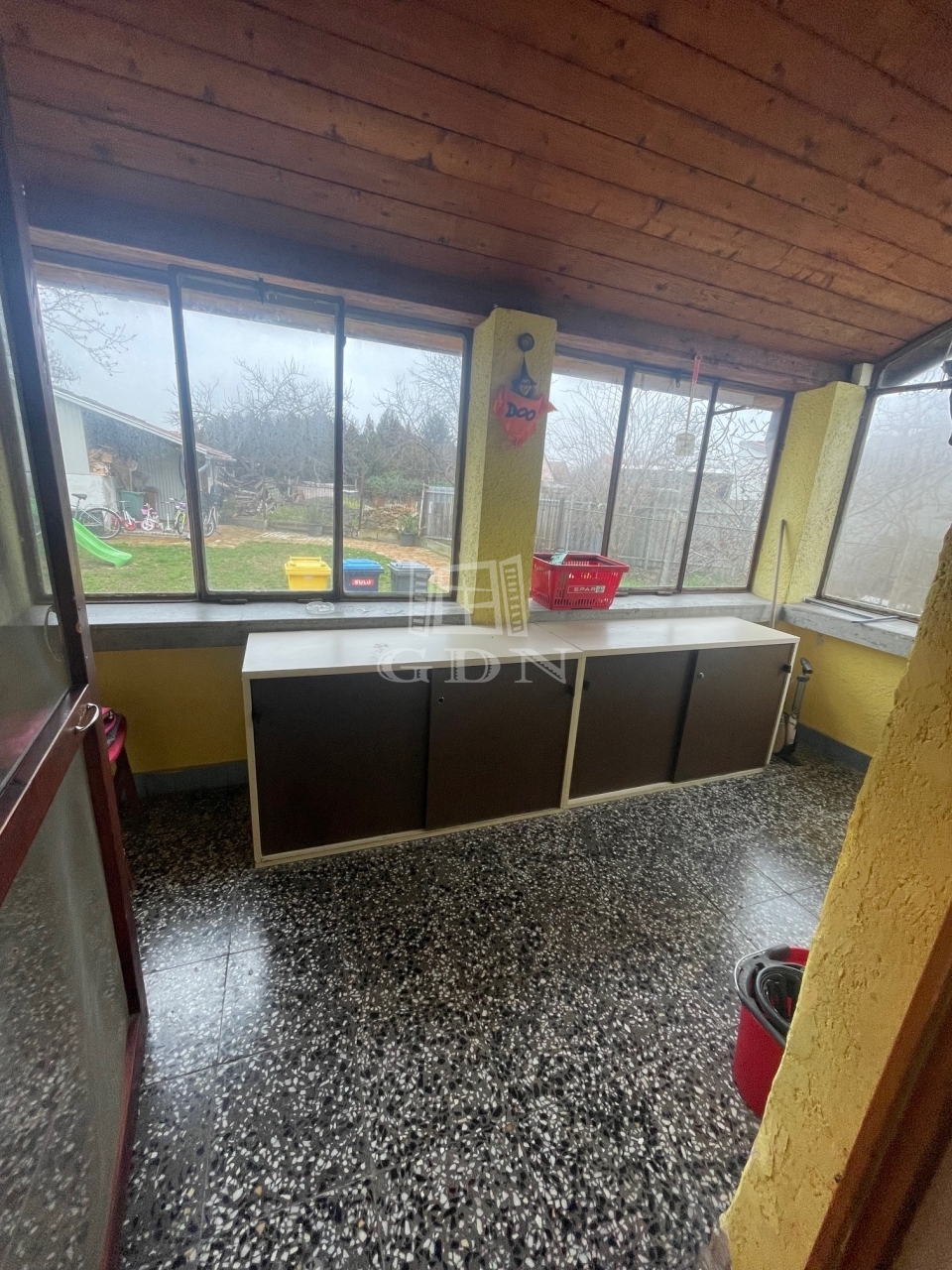 A fő épület 122 m2, belső 2 szintes, az alsó részen egy 20 m2-es fedett teraszról jutunk a házba, ahol wc, és spájz található a bejáratnál. az alsó szinten egy nagy közösségi tér lett kialakítva, itt kaphat helyet a konyha ( kialakítása az új tulajdonosra vár) és az étkező illetve a nappali.
