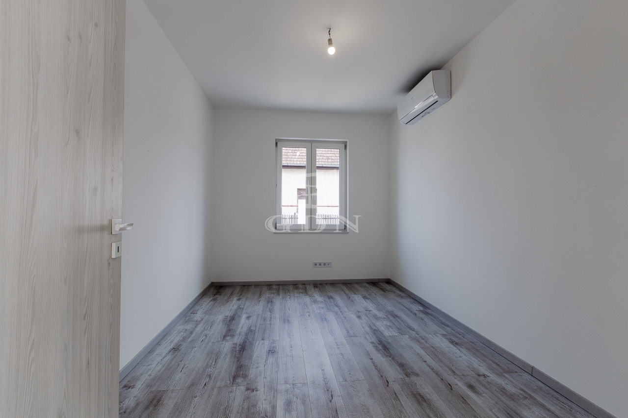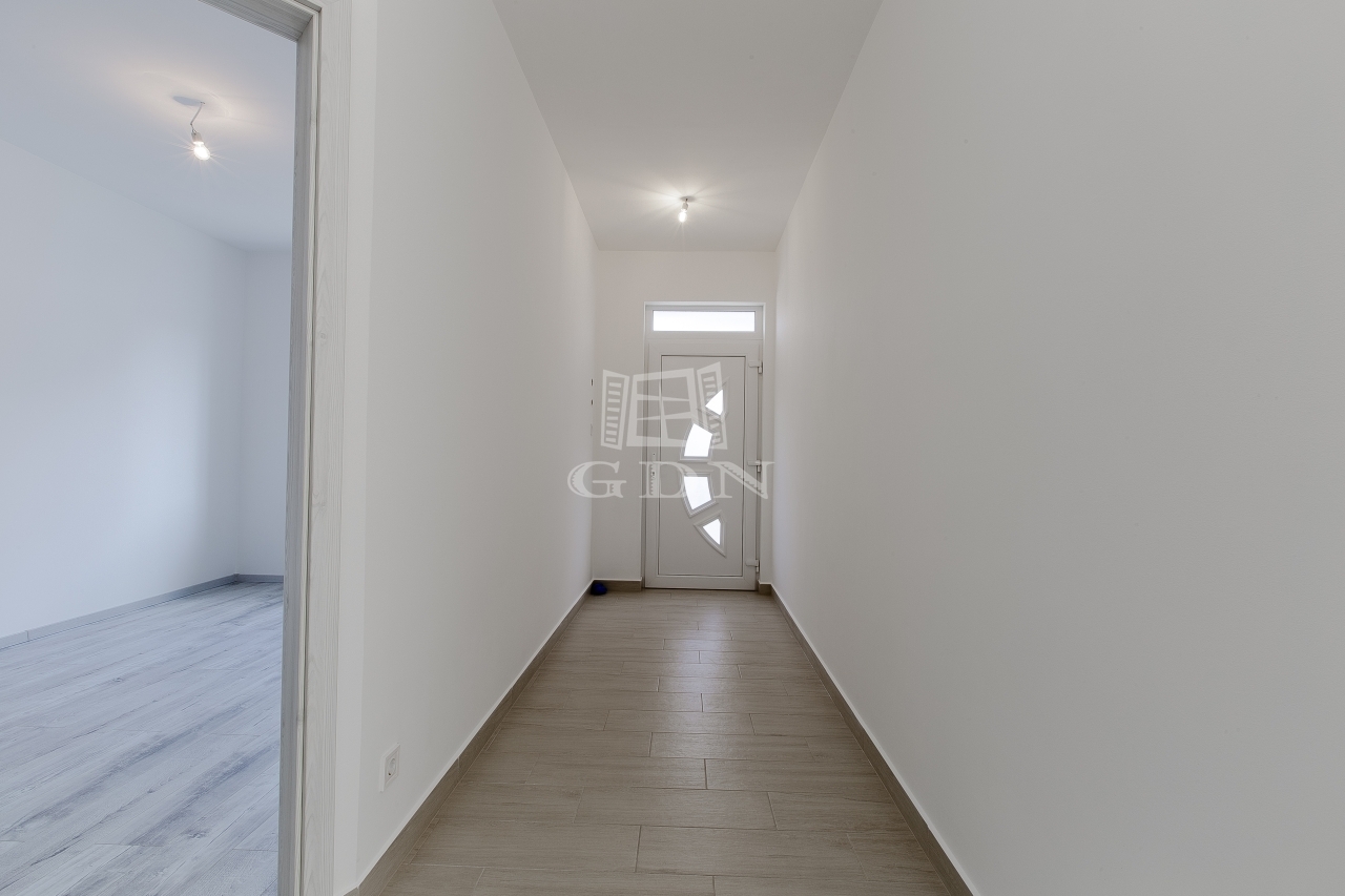 Dekorfóliás belső ajtók. A homlokzati fehér műanyag nyílászárók 3 rétegű hőszigetelő üvegezésűek (U=1,0 W/m²K).