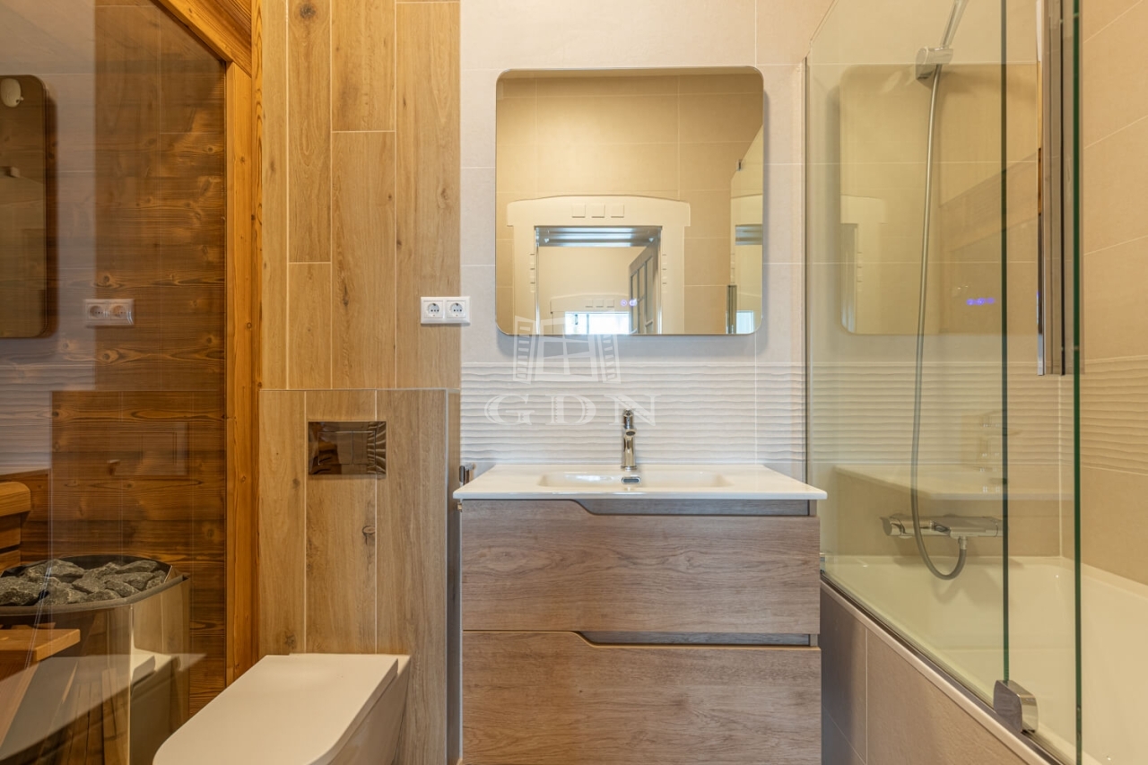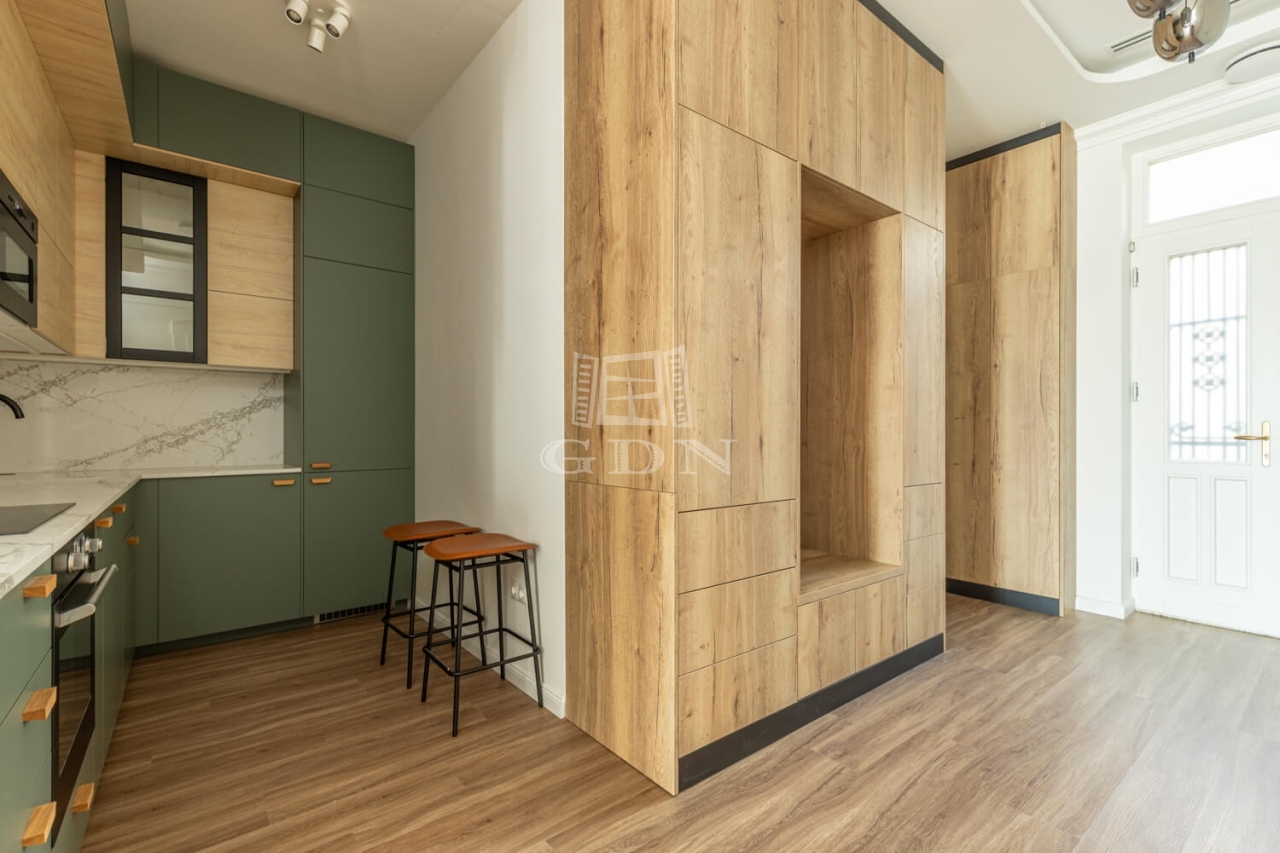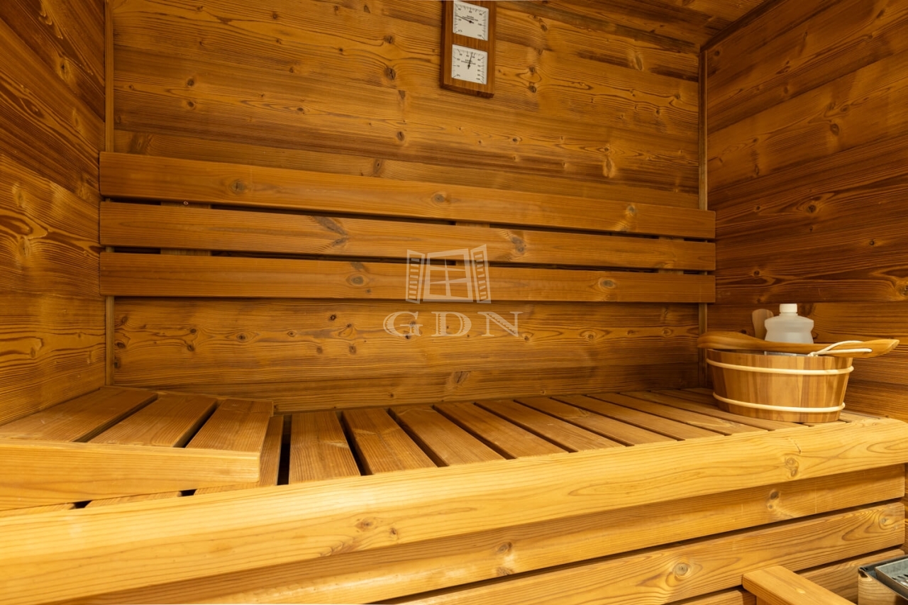 The apartment features two bathrooms: the master has a bathtub and sauna, while the second is equipped with a shower. With 3.2-meter ceilings, herringbone oak parquet, and patinated interior doors, the home exudes timeless elegance, complemented by high-quality custom furniture and designer finishes.