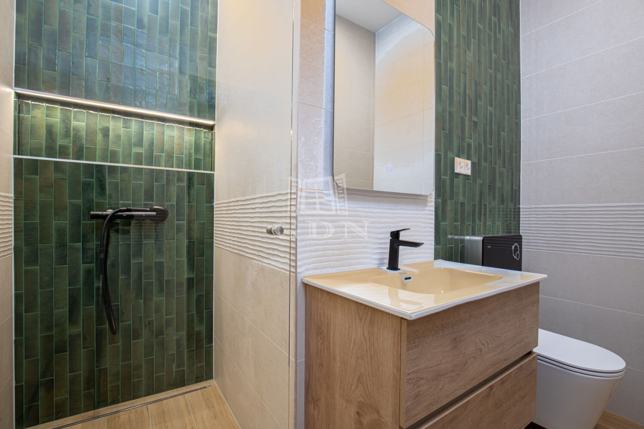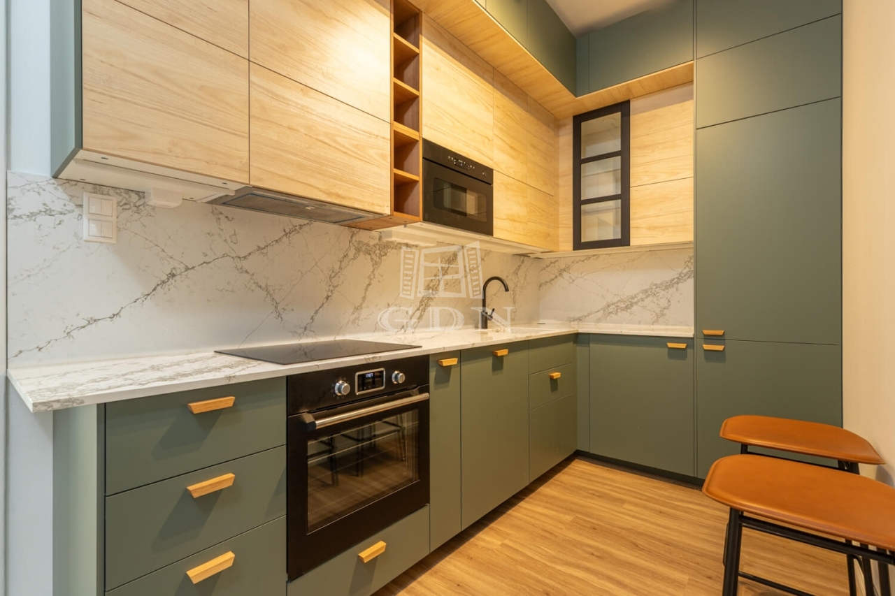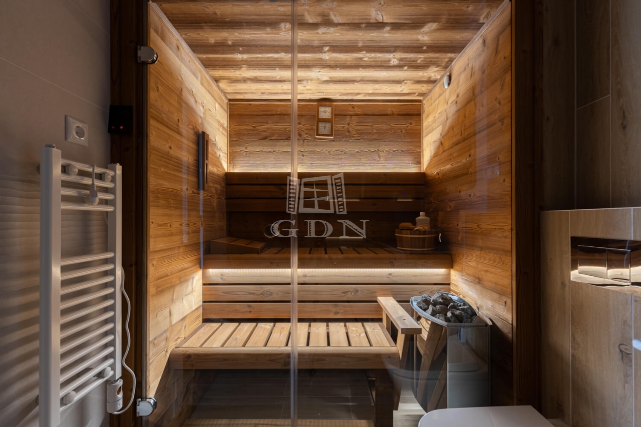 The apartment features two bathrooms: the master has a bathtub and sauna, while the second is equipped with a shower. With 3.2-meter ceilings, herringbone oak parquet, and patinated interior doors, the home exudes timeless elegance, complemented by high-quality custom furniture and designer finishes.