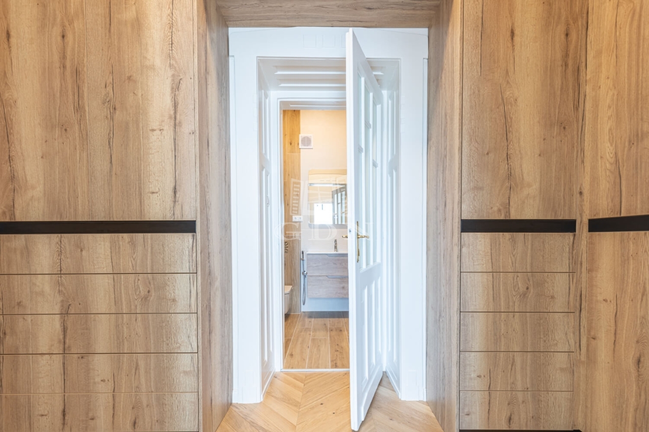 A lakás két fürdőszobával rendelkezik: a fő hálószobához tartozó fürdő kádas és szaunás, a másik zuhanyzós. A 3,2 m belmagasság, a halszálkamintás tölgyfa parketta és a patinás beltéri ajtók a nagypolgári eleganciát idézik, amelyet prémium minőségű, egyedileg tervezett bútorok és designer megoldások egészítenek ki.