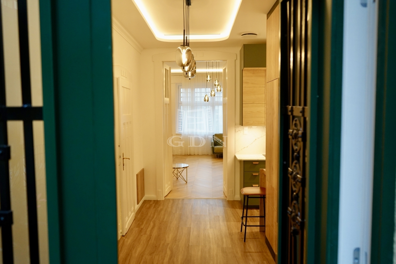 A 3,2 méteres belmagasság, a klasszikus halszálkamintás tölgyfa parketta és a felújított, patinás beltéri ajtók időtálló nagypolgári hangulatot teremtenek, amely harmonikusan kapcsolódik a modern megoldásokhoz. Az enteriőr kifinomultságát designlámpák és gondosan kiválasztott burkolatok erősítik, egységes és elegáns összképet alkotva.