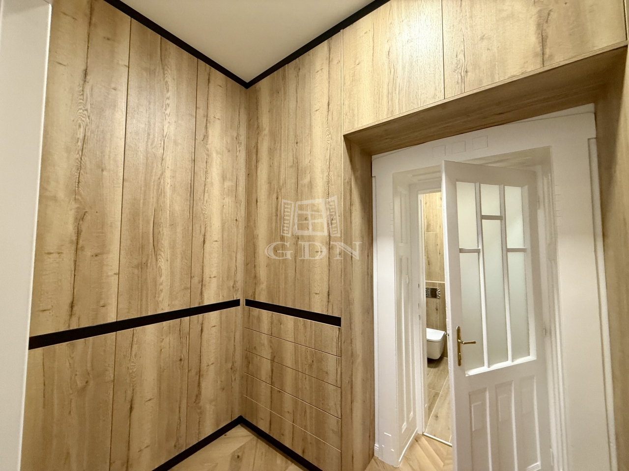 A fő hálószobához külön gardróbrész kapcsolódik, amely kényelmes és bőséges tárolási lehetőséget biztosít. A lakás egészében egyedileg tervezett, prémium minőségű beépített bútorok szolgálják a funkcionalitást és az esztétikumot.
