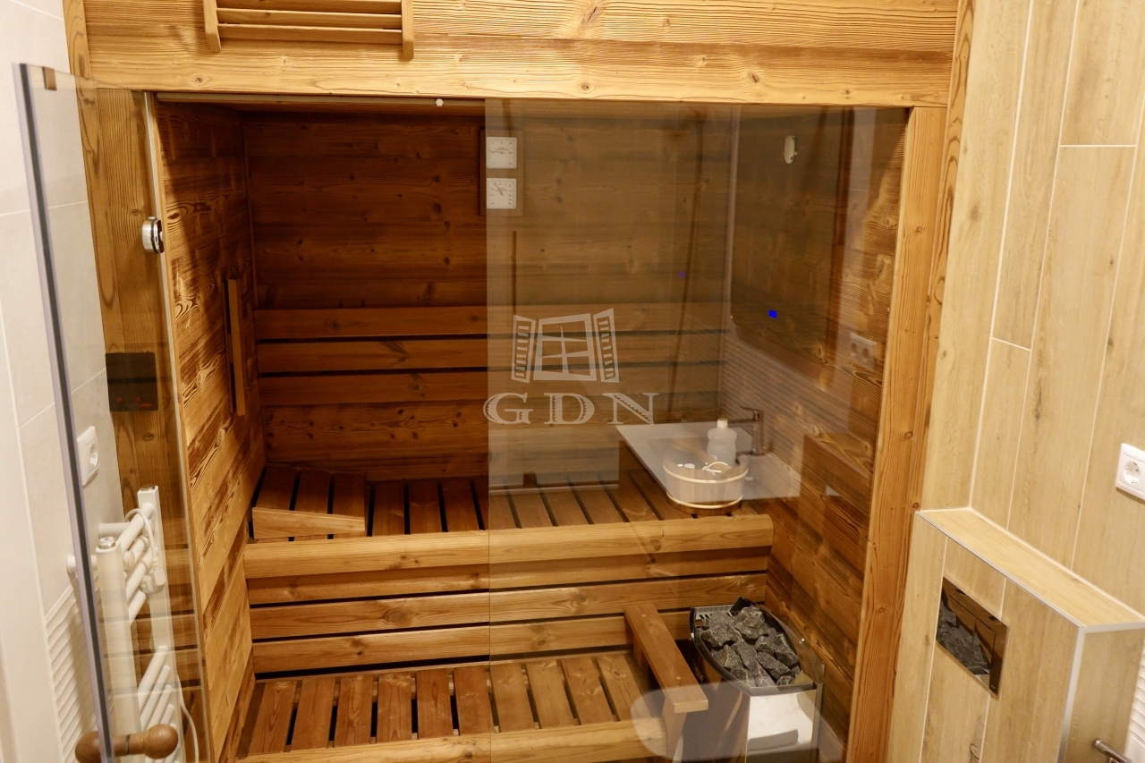 Az inagtalan két fürdőszobával rendelkezik: a fő hálószobához kapcsolódó kádas fürdőben egy szauna is helyet kapott. A másik fürdőszoba zuhanyzós, mindkettő fürdőszobában WC is van. A déli tájolásnak köszönhetően a lakás rendkívül világos.