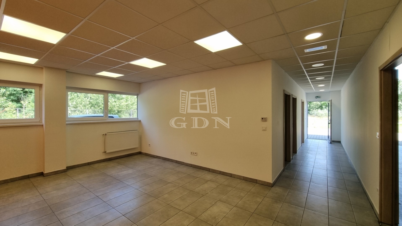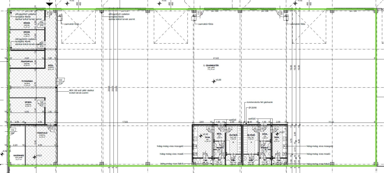 Elosztását tekintve egy csarnoktérből (788m2), egy 111m2-es, 4-5 helyiséges irodablokkból és két darab, egyenként 32m2-es öltözőkkel, teakonyhával és mosdókkal felszerelt szociális blokkból áll.
