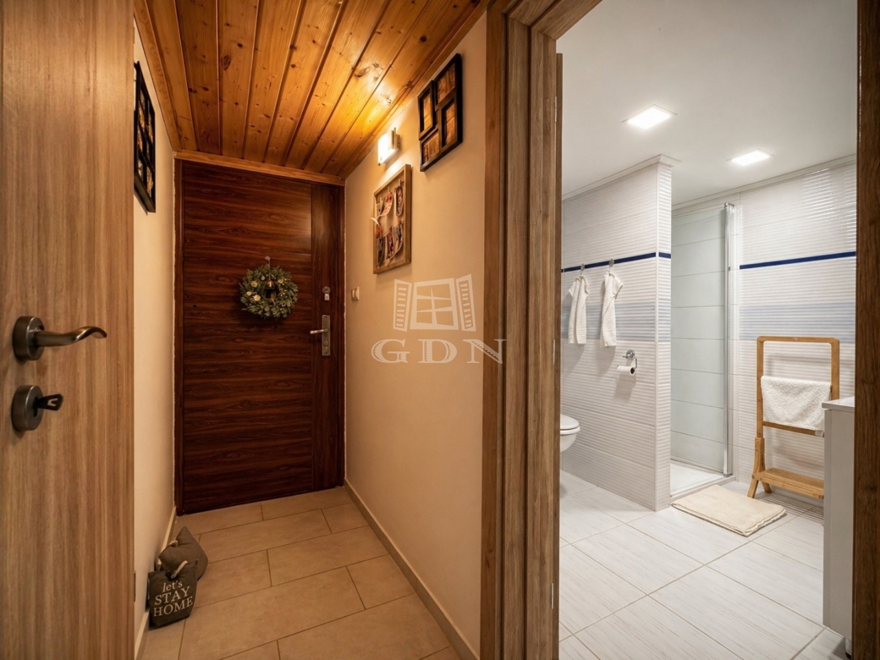 Az alsó szinten egy félkész, teraszkapcsolatos nappali és egy fürdőszoba található, amelyek a közeljövőben burkolást és szerelvényezést kapnak. Ezen a szinten helyet kapott még egy WC-s háztartási helyiség és egy kazánház is. Az emeleten található a jelenlegi élettér: szélfogó, fürdőszoba, előszoba, hálószoba, konyha-étkező és nappali. A tetőtér (padlás) jelenleg kihasználatlan, beépítése előkészített.