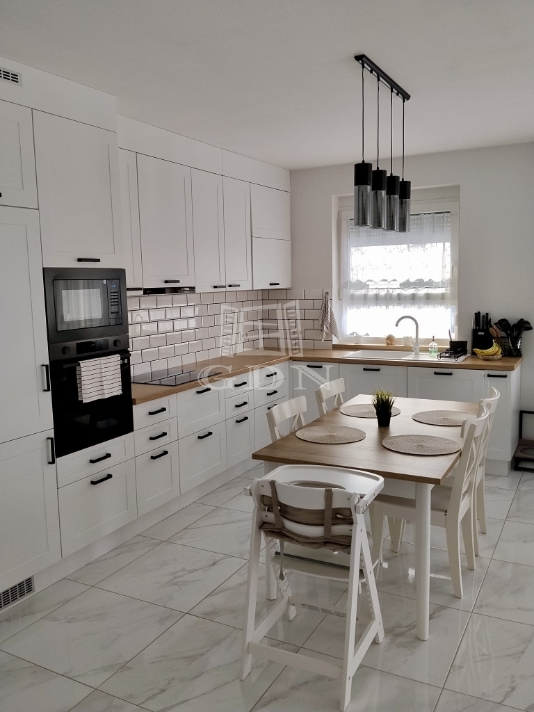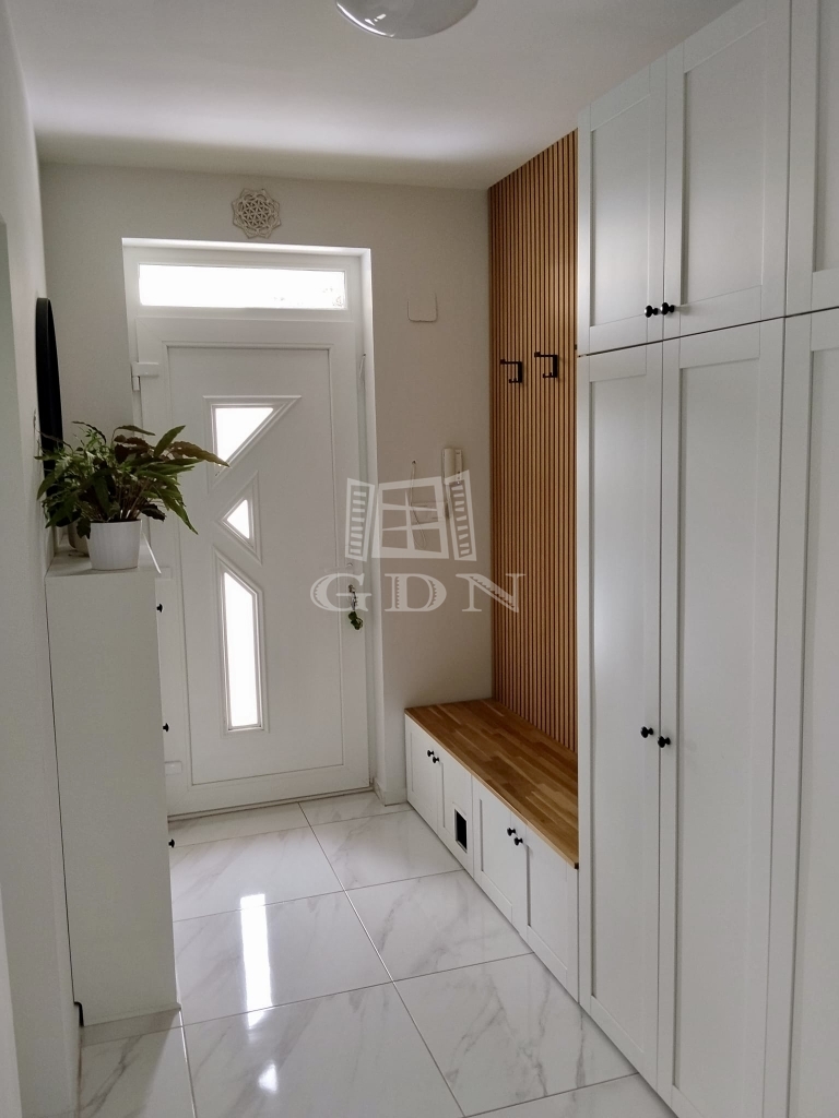 A ház nettó 95,49 négyzetméteres lakóterülettel rendelkezik, amelyet átgondolt, praktikus elrendezés jellemez. A tágas, amerikai konyhás nappali a lakás központi tere, amely természetes fényben gazdag, jól berendezhető, és közvetlen kapcsolatban áll a kerttel. A három külön nyíló szoba kényelmes életteret biztosít akár családok számára is. A konyha teljesen gépesített, a beépített bútorokkal és eszközökkel együtt a vételár részét képezi, ahogyan a fürdőszoba berendezése és a zuhanykabin is. A padlástér további praktikus tárolási lehetőséget kínál.