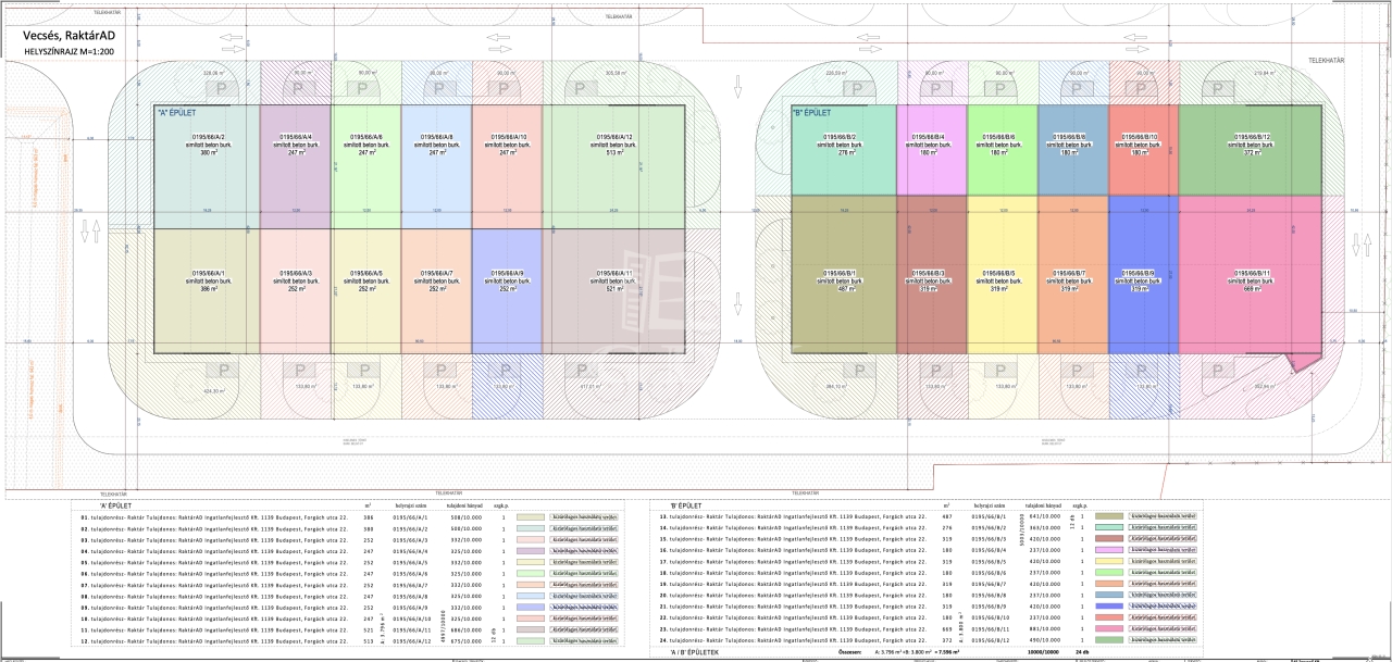 A csarnokokhoz tartozik a csarnok előtt lévő terület, illetve minden csarnokhoz jár plusz parkolóhely is.